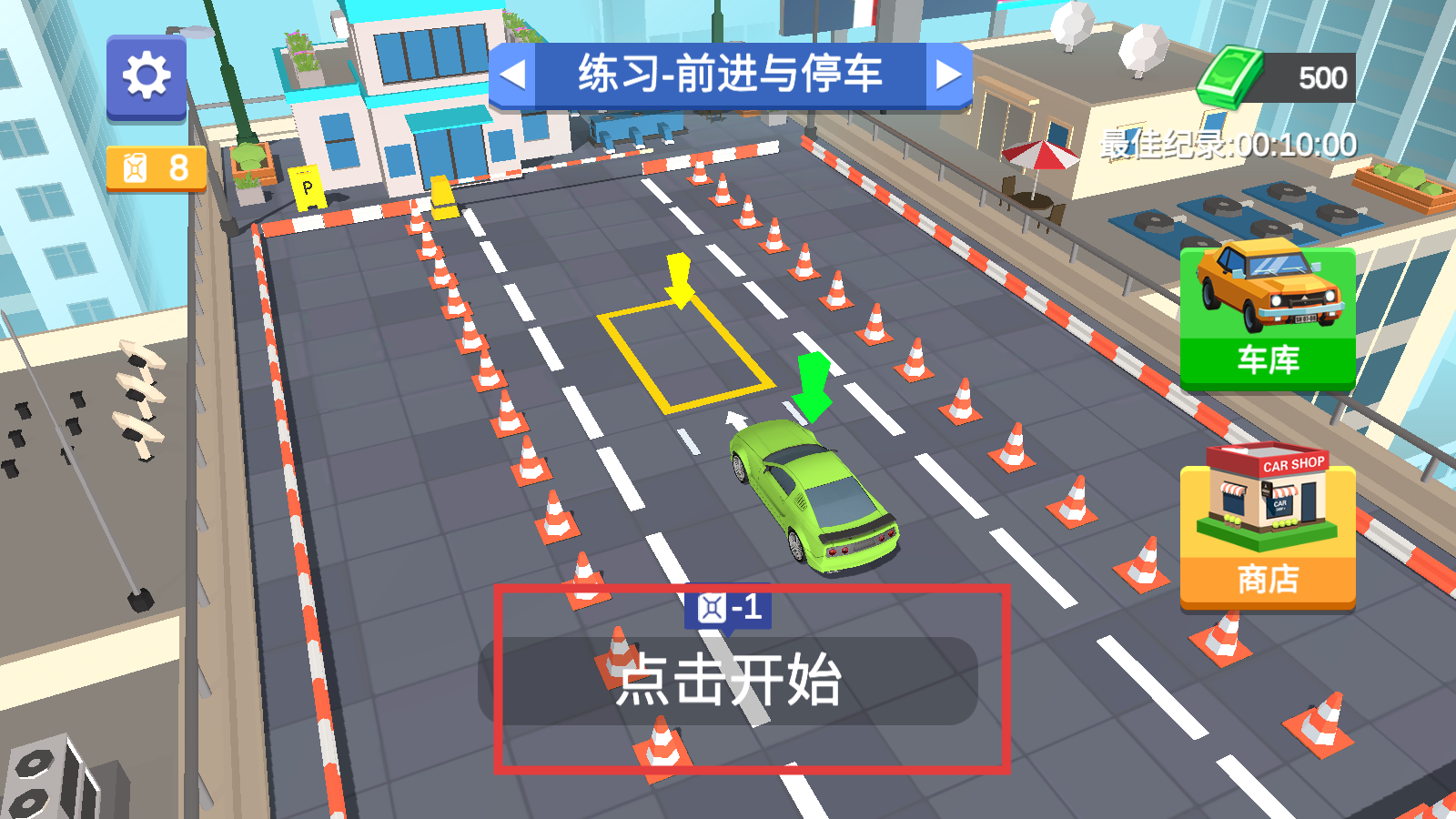 1、玩家下載游戲之后然后在游戲界面里面,點擊圖標標記點擊開始按鈕,進入練習前進與停車等關卡,開啟駕駛挑戰。