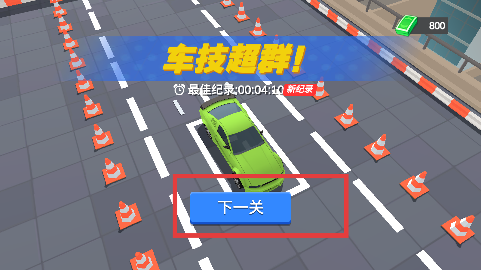 4、玩家當成功按照要求將車輛停入指定的停車區域,完成當前關卡任務后,點擊下一關按鈕。