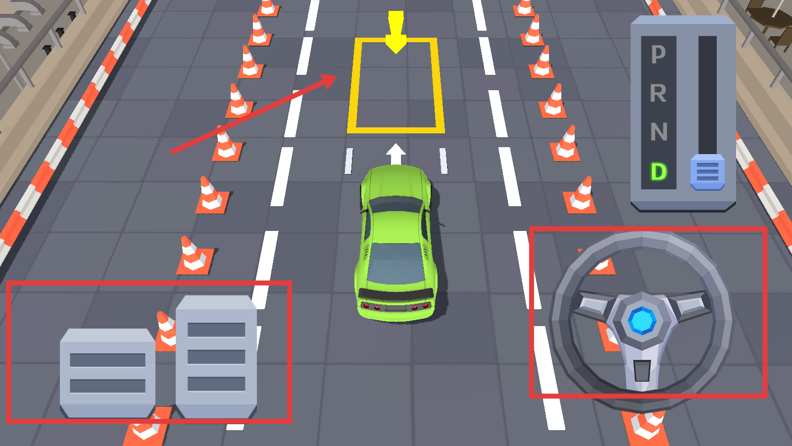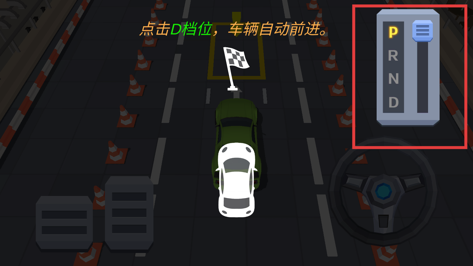 3、利用屏幕上的方向盤按鈕控制車輛的行駛方向,通過剎車和油門按鈕來控制車輛的速度和制動,使車輛順利停進停車方位。