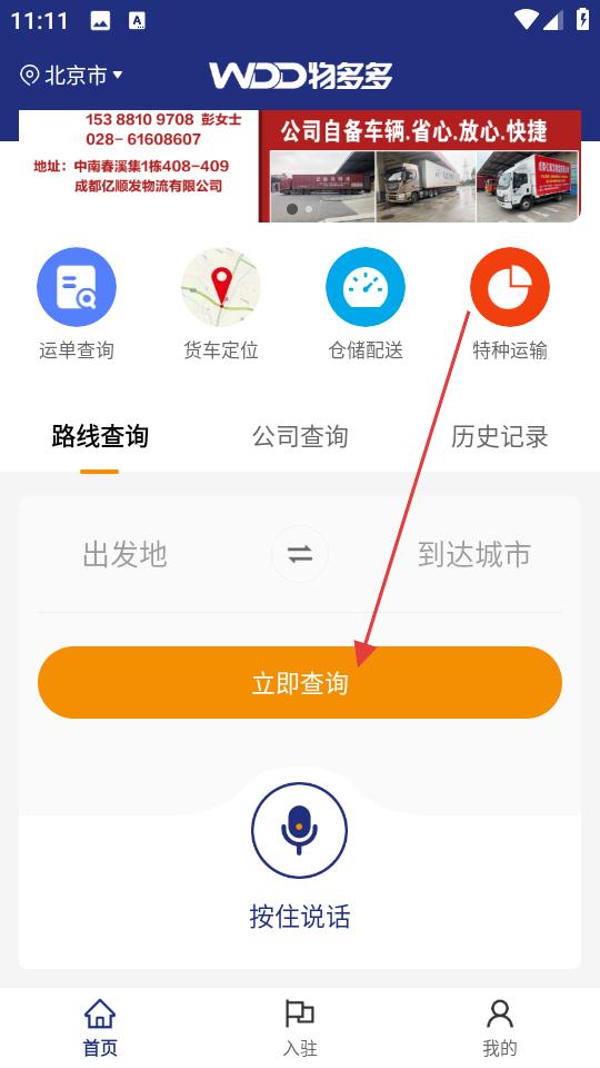1、開啟物多多app,于首頁路線查詢板塊,準確錄入出發地和到達城市信息,點擊立即查詢按鈕,迅速獲取對應路線及貨源匹配詳情,高效規劃運輸任務。