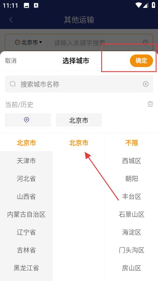 3、在選擇城市環節,通過搜索或瀏覽,選定目標城市如北京市,確認無誤后點擊確定,完成城市選擇,為后續運輸業務開展精準定位區域。