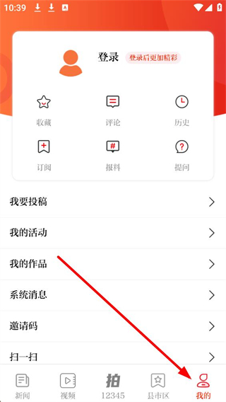 2、我的界面,能看到登錄入口,還有收藏、評論、歷史等功能選項,點擊登錄進入登錄界面。
