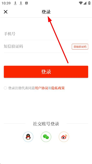 3、進入登錄界面,可輸入手機號、獲取短信驗證碼后點擊登錄,也可選擇QQ、微信、微博等社交賬號登錄方式,登錄前需勾選同意用戶協議和隱私政策。