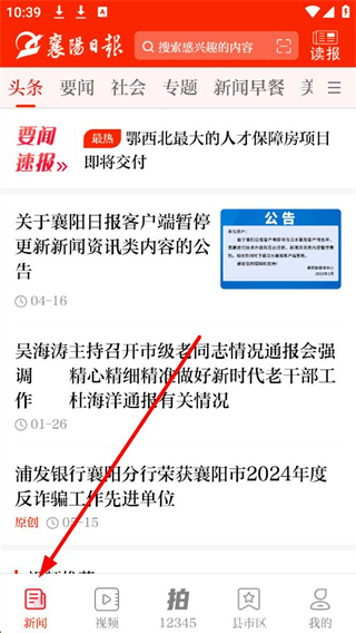 1、打開襄陽日報APP,進入新聞界面,可看到頭條、要聞等欄目,展示多條襄陽本地新聞資訊,點擊底部我的按鈕進入個人界面。