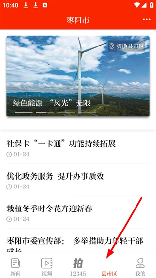 4、登錄后返回首頁,點擊底部縣市區按鈕可進入對應區域新聞界面,如棗陽市新聞界面,瀏覽該區域的新聞資訊,了解當地動態。