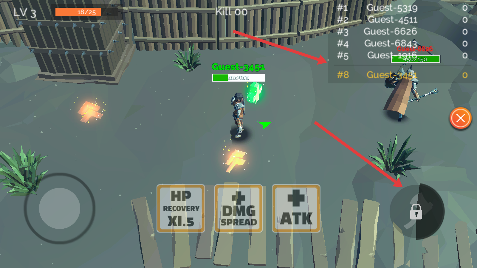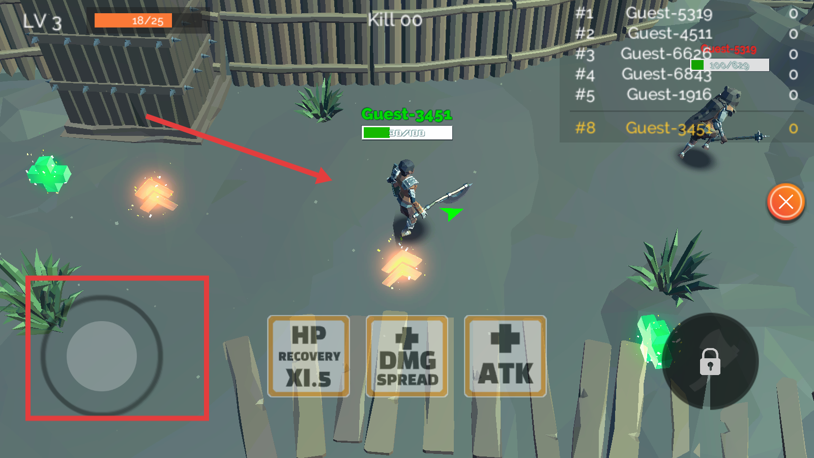 3、在游戲場景中通過屏幕左下角的虛擬搖桿來操控角色移動,在地圖中靈活穿梭,尋找敵人進行戰斗,或者躲避敵人的攻擊。