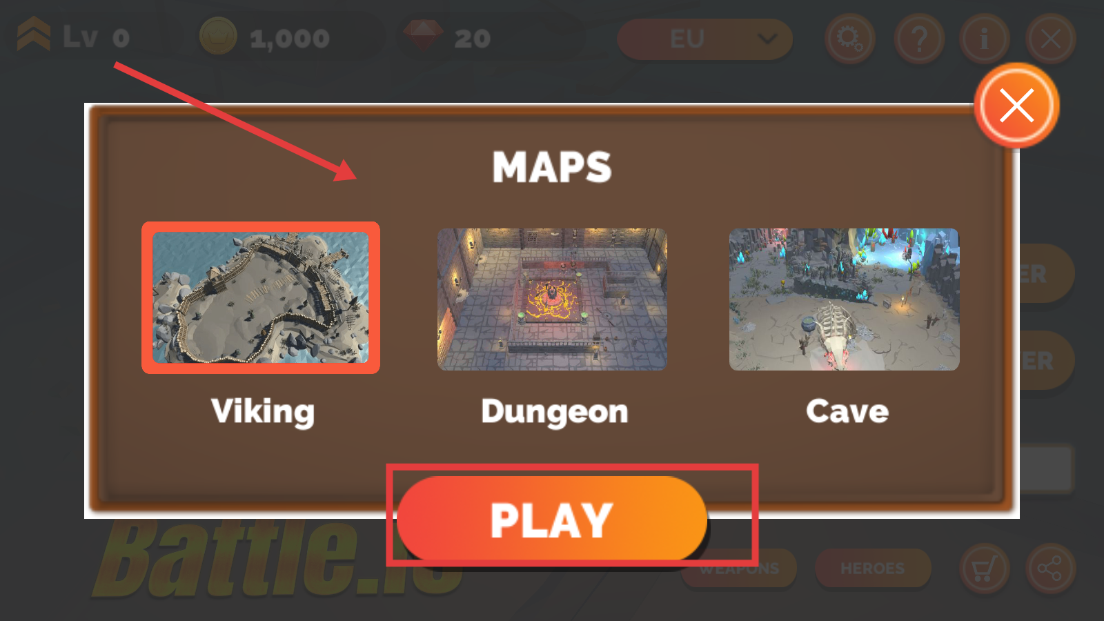 2、進入模式選擇后的地圖界面,有Viking維京、Dungeon地牢等不同風格的地圖可供選擇,選好地圖后點擊PLAY按鈕,即可進入對應地圖開始游戲。