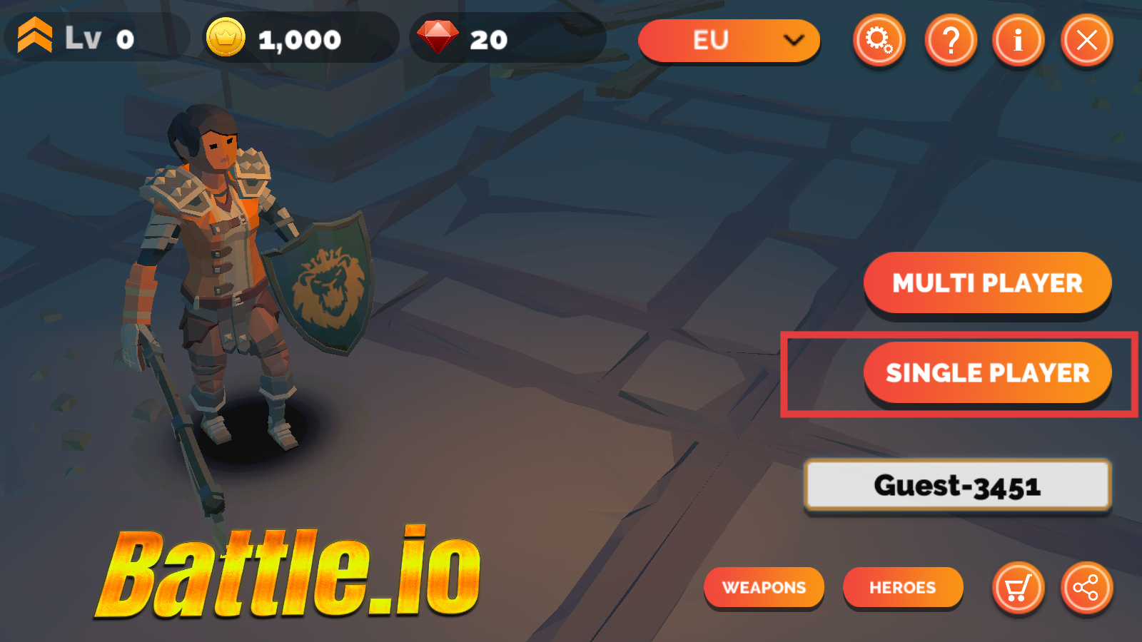 1、玩家下載游戲之后然后點擊進入,在游戲主界面可選擇Single Player單人模式,進入單人對戰場景,獨自挑戰游戲中的敵人。