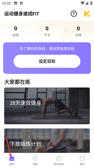 1、進入鍛煉首頁,可查看運動千卡分鐘的統計數據,支持設定每周健身目標,還能查看大家都在練的熱門健身計劃。