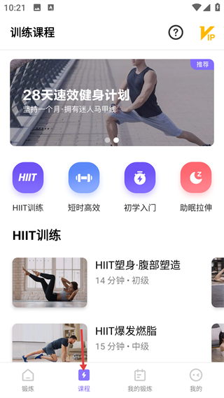 2、進入課程頁,可選擇HIIT訓練初學入門等分類課程,查看不同難度與時長的課程選項,適配自身的訓練需求。