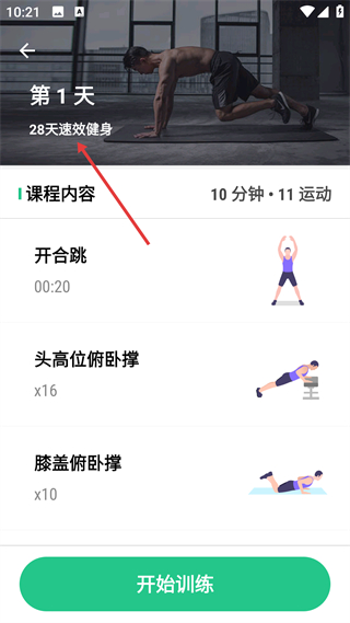 3、進入該課程詳情,查看28天速效健身單日訓練內容,包含動作名稱時長次數及示意圖,點擊開始訓練啟動課程。