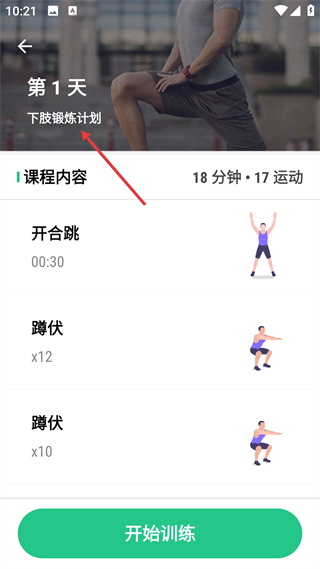 4、進入該課程詳情,查看下肢鍛煉計劃單日內容,標注總時長與動作數量,搭配圖示,了解流程后開啟訓練。