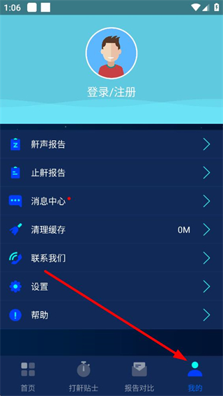 2、點擊我的選項,進入個人界面,可進行登錄、注冊操作,查看鼾聲報告、止鼾報告、消息中心等,還有清理緩存、聯系我們、設置、幫助等功能入口。