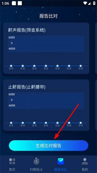 4、進入報告對比界面,可生成鼾聲報告和止鼾報告的比對報告,通過數據圖表直觀查看差異,幫助用戶了解鼾聲和止鼾情況的變化。