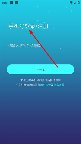 3、手機號登錄、注冊界面,輸入手機號碼,點擊下一步,未注冊的手機號碼驗證后自動注冊,需勾選同意用戶協議及隱私條款。