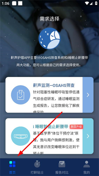 1、進入首頁界面,可選擇腰帶功能,OSAHS篩查針對阻塞性睡眠呼吸暫停低通氣綜合癥,止鼾腰帶基于體位干預療法。