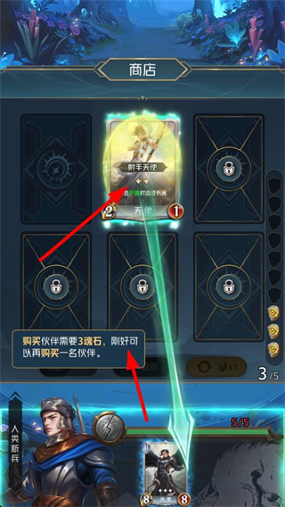 2、購買伙伴需要3魂石,當魂石數量足夠時,可選擇購買如射手天使這樣的伙伴,擴充自身的伙伴陣容。