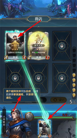 1、商店界面可獲取殺戮天使等伙伴,兩個相同伙伴能合成,合成后屬性更高還能得到魂石,可積累魂石用于后續兌換。