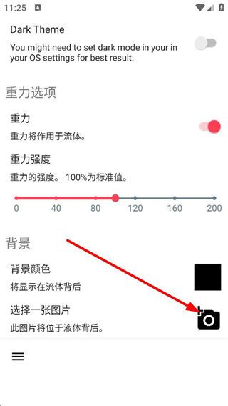 4、設置頁面還可調整重力選項、背景等參數,點擊選擇一張圖片選項,可添加自定義背景圖,讓流體效果與背景結合呈現更豐富視覺。