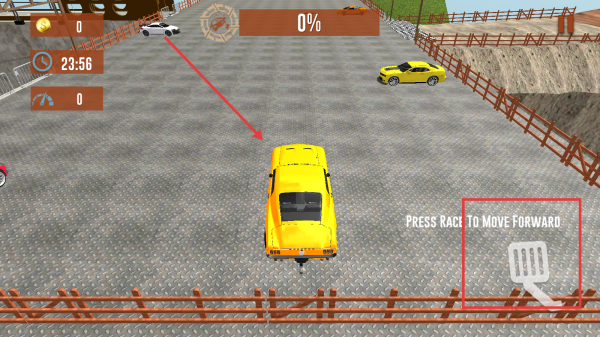 3、玩家在場景里面選擇好車輛后,點擊屏幕上的PRESS RACE TO MOVE FORWARD按鈕前進按鈕讓車輛前進。