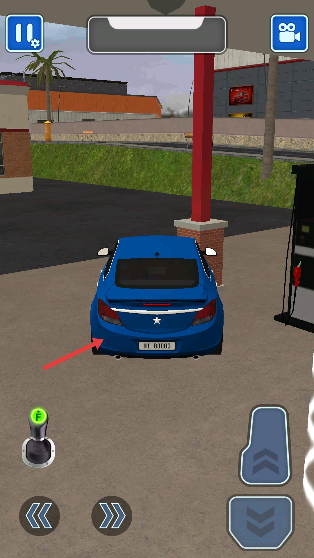 4、駕駛藍色轎車時,同樣借助油門和方向鍵,小心駕駛,將車平穩??吭诩佑驼镜戎付ㄎ恢?,注意周圍環境,確保停車準確。