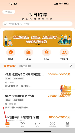 1、全職板塊可全國搜職位,有物流專場招聘會,設附近、名企等分類,展示騰訊、螞蟻集團等企業的最新高薪職位。