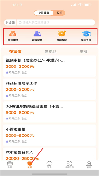 2、監職板塊分今日兼職、校招,有高薪、在家可做等專區,呈現視頻審核、語音主播等在家兼職崗位,滿足靈活就業需求。
