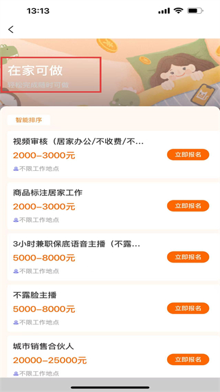 3、在家可做板塊聚焦居家兼職,展示視頻審核、商品標注等崗位,薪資2000-8000元不等,不限地點,提供立即報名入口。