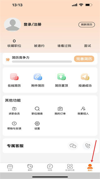 4、我的板塊可登錄注冊,管理收藏職位等,有在線簡歷等功能,還可完善簡歷、參與求職會員,助力管理求職事務。