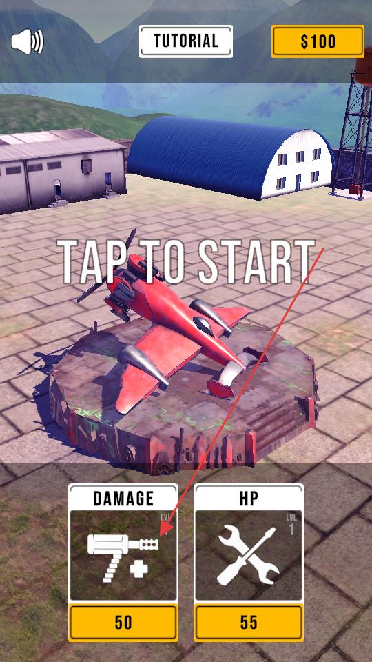 1、進入游戲看到帶有飛機和TAPTOSTART字樣的界面,點擊屏幕操控飛機起飛,開始射擊闖關之旅。