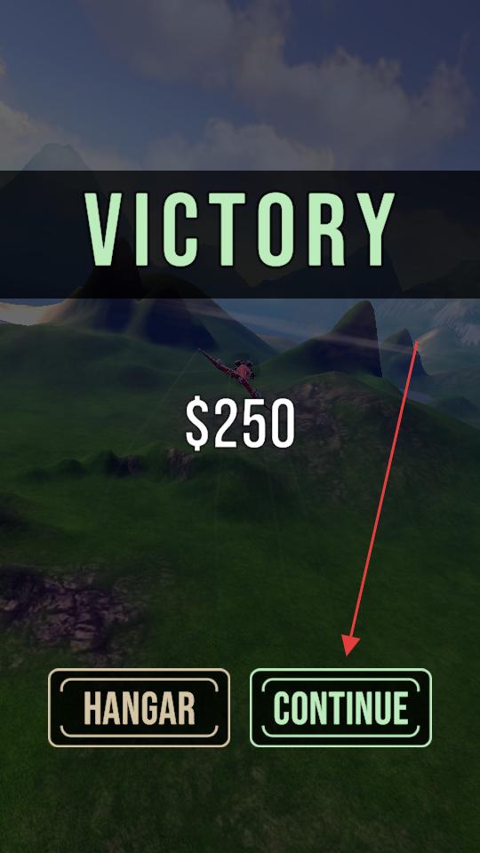 4、成功完成闖關后出現VICTORY界面,獲得金幣獎勵,此時點擊CONTINUE按鈕,繼續下一關的飛機射擊闖關。