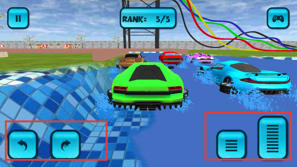 3、通過屏幕左下角的左右方向按鈕控制賽車轉向,利用屏幕右下角的油門和剎車按鈕來控制賽車的速度,在水上賽道上與其他賽車展開競速。