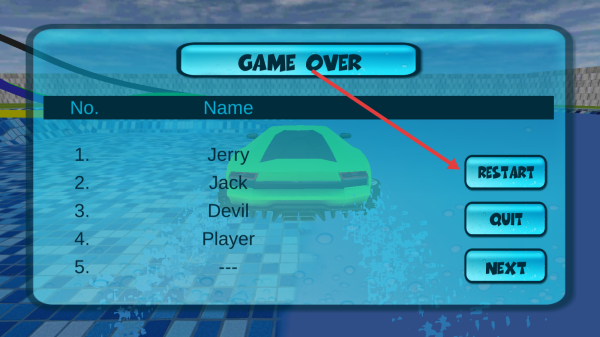 4、玩家如果在游戲里面比賽失敗,出現GAME OVER提示界面,點擊RESTART按鈕可以重新挑戰當前關卡。