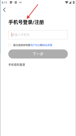 1、進入應用后先進入手機號登錄/注冊界面,需在輸入框填寫手機號,勾選同意用戶協議和隱私政策后,才能激活下一步按鈕繼續操作。