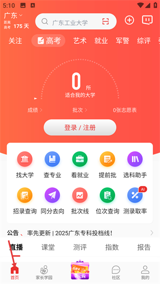 2、完成登錄后進入首頁,可看到距離高考的天數,還能使用找大學查專業看就業等功能,也可通過搜索框查找目標院校,輔助高考志愿相關事項。