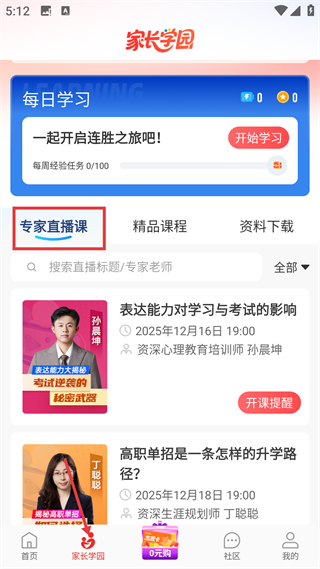 3、點擊底部家長學園選項進入對應頁面,可參與每日學習獲取經驗,還能查看專家直播課,選擇感興趣的直播設置開課提醒,學習相關內容。
