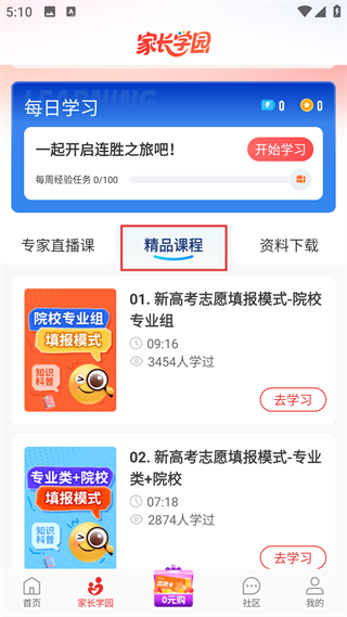 4、在家長學園頁面切換到精品課程標簽,可看到高考志愿填報相關的科普課程,點擊對應課程旁的去學習按鈕,即可進入課程內容開始學習。