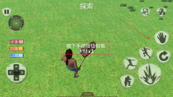 4、遇到木材等資源時,按下手動按鈕可拾取,積累資源用于制作工具、搭建庇護所等。