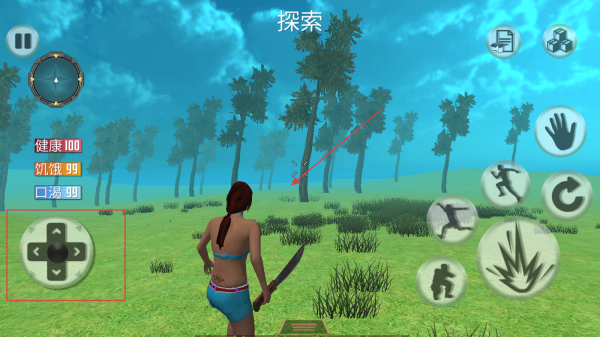 3、玩家需要通過左側虛擬搖桿控制角色移動,在野外場景中自由探索,尋找生存所需的資源與地點。