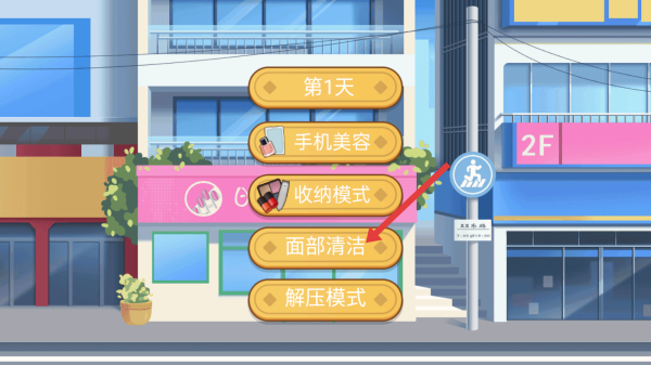 1、進入游戲看到有第1天、手機美容等模式選項,點擊面部清潔,開始面部護理流程。