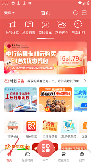 2、首頁有地鐵線路、日票等功能入口,展示中行優惠券活動和地鐵公告,還有地鐵e站等服務入口。