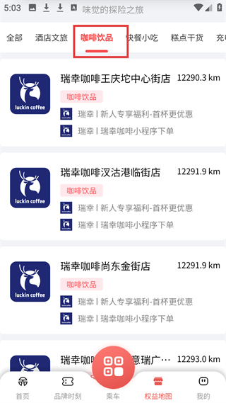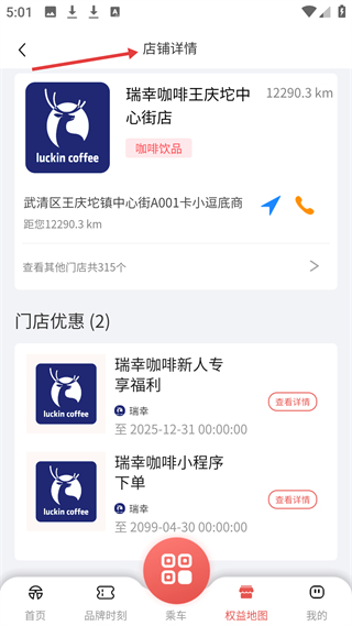3、權益地圖咖啡飲品板塊展示瑞幸多家門店,如王慶坨中心街店,標注距離和新人福利等優惠。