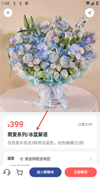 3、簡.愛系列冰藍絮語花束詳情頁,售399元已售22件,含百合、蝴蝶蘭等,可選配送地區后加購或購買。