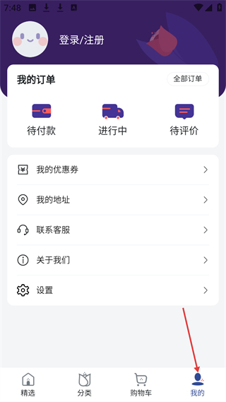 4、花樂頌我的頁,可登錄注冊,展我的訂單及優惠券、地址等功能,方便用戶管理訂單和個人信息。