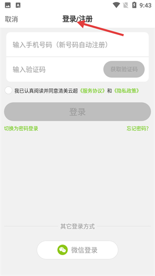 1、登錄頁支持手機號驗證碼新號自動注冊、和微信登錄,需同意服務協議、隱私政策后完成登錄。