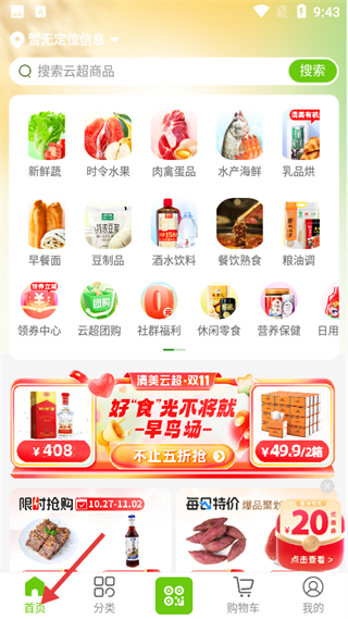 2、首頁設搜索欄,分類含新鮮蔬、時令水果等生活品類,有雙11早鳥場活動及限時搶購板塊,展示優惠商品。