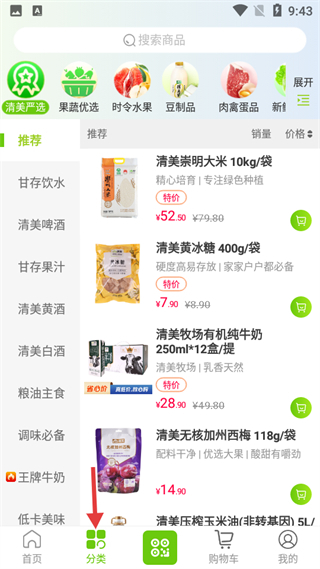 3、分類頁有清美嚴選等入口,可按品牌、品類篩選,展示清美崇明大米、黃冰糖等特價商品,方便查找選購。