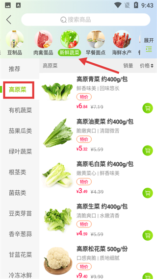 4、新鮮蔬菜分類可按高原菜、有機蔬菜等細分,展示高原青菜、油麥菜等多款特價蔬菜,助力用戶選購新鮮蔬菜。