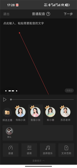 4、在普通配音頁面輸入或粘貼需要配音的文字,選擇合適的主播比如導購小吳等,調整語速語調等參數,完成配音內容的設置。