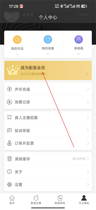 1、進入個人中心頁面,可查看我的作品我的收藏等板塊,選擇成為配音會員選項,進入VIP會員中心,了解會員套餐及權益內容。